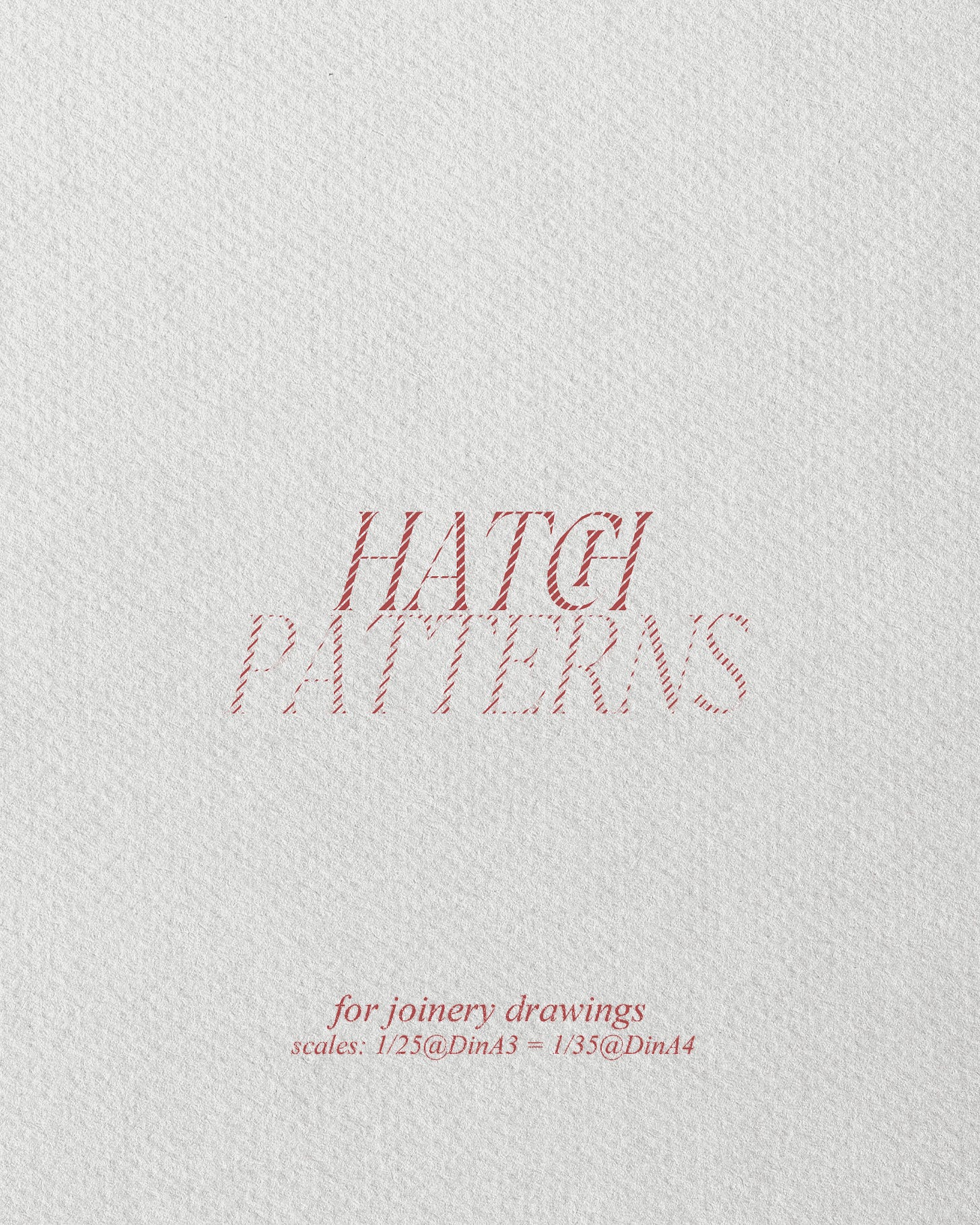 Here are the hatch patterns we use in our joinery drawings. The values are optimized for 1/25 scales and sorted as follows: